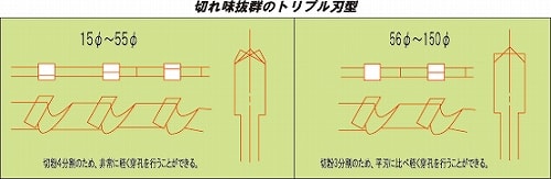 ◆超硬チップを剣先刃と平刃とに組合せ、剣先刃が平刃より0.3mm高くしている為、最初に剣先がセンターを削り、続けて平刃の左右で切削していく。その結果3分割され切削していくのでビビリも無く軽い力で穴をあけられる。 有効長25mmあり切粉の排出講をもうけている為、磁気ボール盤、卓上ボール盤ではステンレス20mm厚の穴があけられる。(板厚5mm以上のものを穿孔される場合スプリングを取り外してからご使用ください)ステンレス切削時の焼き付き色も付きません。