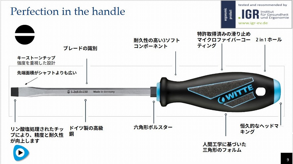 Witteは1875年にドイツで裁縫針の製造会社として創業しました。 20世紀に入ると高い品質と革新性を追求し手作業工具の製造へと事業を拡大していきます。 1950年代からはスクリュードライバーの分野で国際的な名声を得るようになりました。 人間工学に基づいた握りやすいグリップデザインや精密な作業を可能にするビット形状など使い手の視点に立った製品開発が特徴です。 200年以上の歴史を持ち、世界中のプロフェッショナルから信頼されているドイツを代表する老舗工具メーカーです。